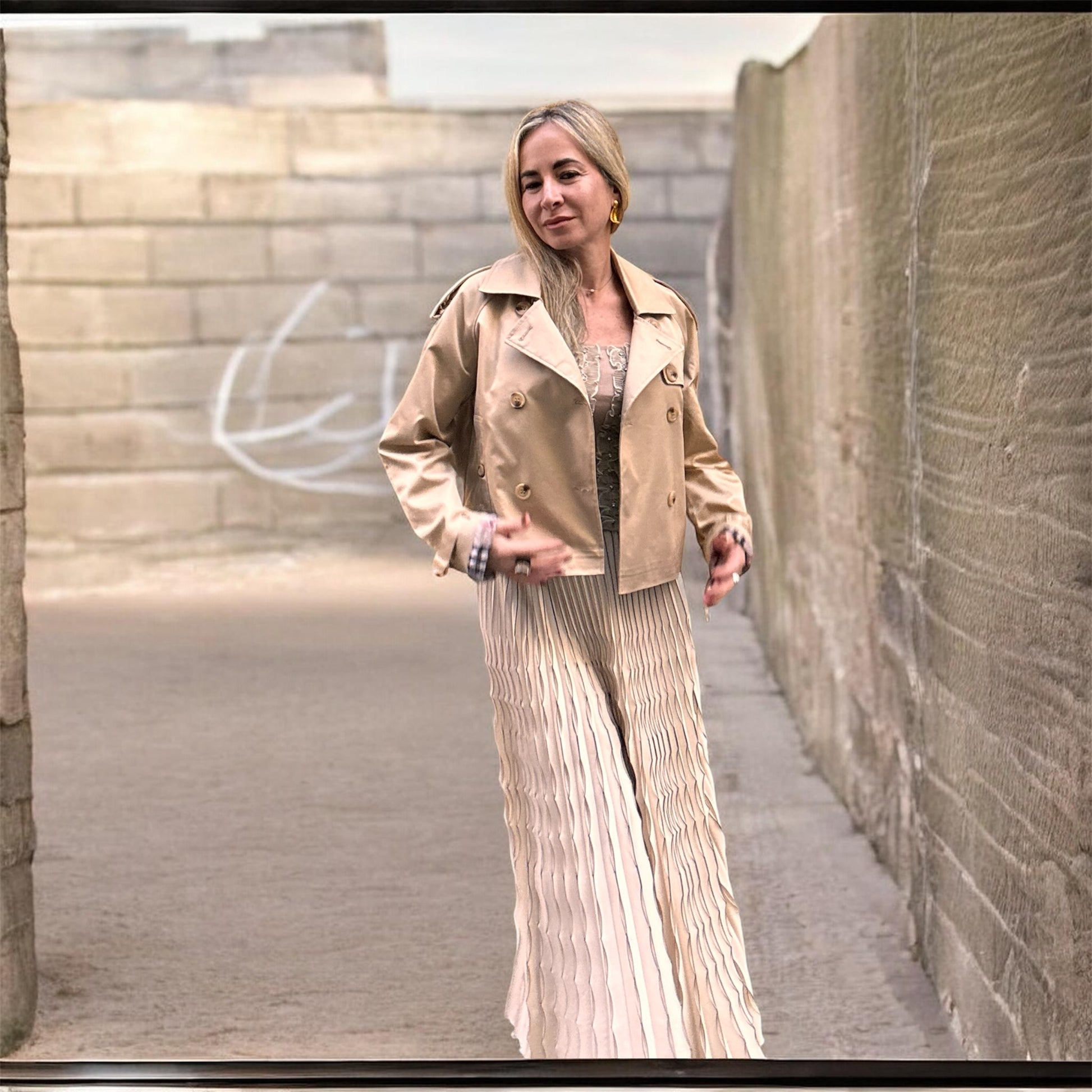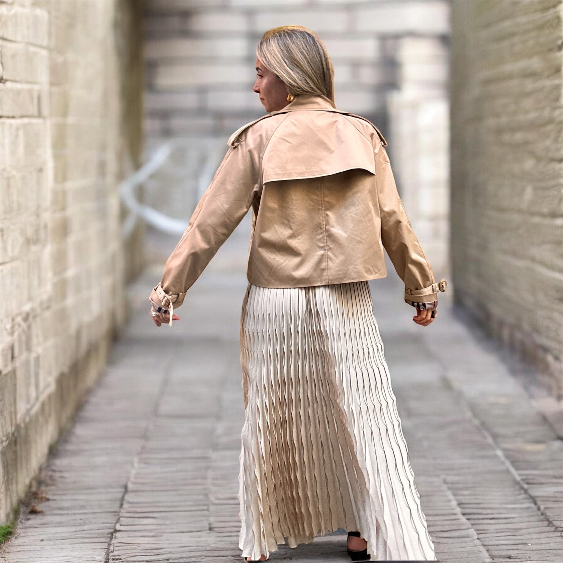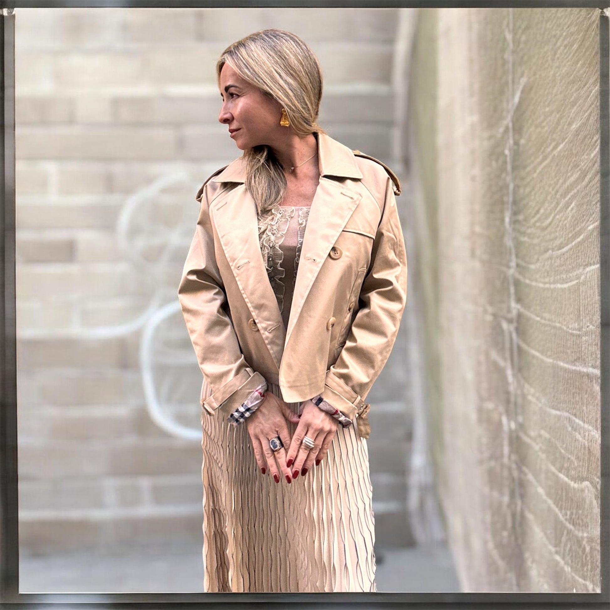 Gabardina corta en tono beige tostado, un básico reinventado con un toque sofisticado. Su diseño atemporal se eleva con un interior de inspiración clásica, aportando ese detalle especial que marca la diferencia.